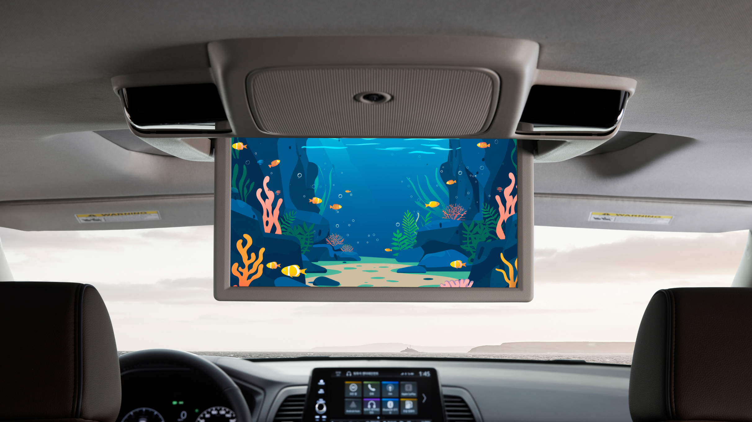 • 10.2-inch screen with HDMI input and wireless headphones for rear passengers.
